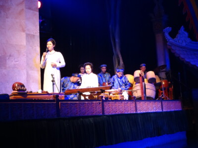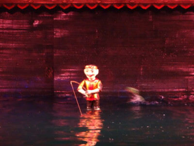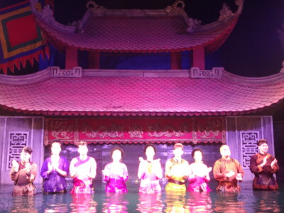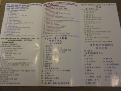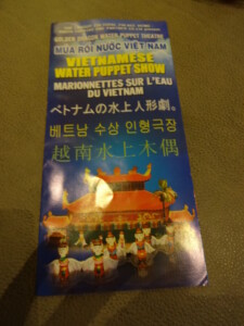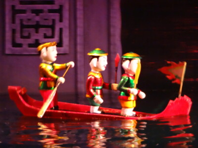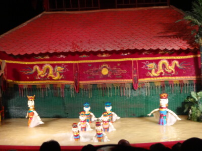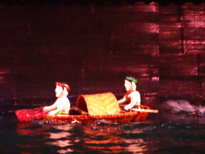 水上を舞台に色鮮やかに塗られた人形たちが物語や音楽にそって動き回ります。ベトナムの神話や風俗を題材にしているそうです。ベトナム語で展開されるので、言葉はわかりませんが、コメディーチックなストーリーや舞台袖の生演奏と合わせて動く人形たちに自然と笑ってしまいます。