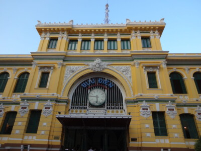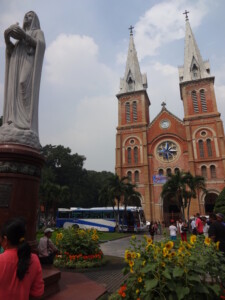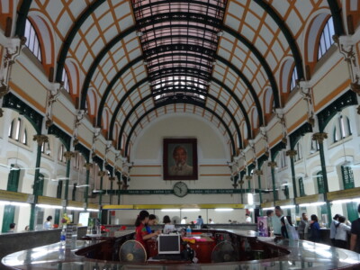 最後は「サイゴン大教会」です。ショッピング等で観光客がお世話になる「ドンコイ通り」の北端に位置するカトリック教会です。集合場所としても利用できます。フランス統治下の19世紀後半に建てられ、外壁の赤レンガやステンドグラスの素材はすべてフランス製とのことです。そのすぐ隣に「中央郵便局」もあります。同じくフランス統治下でヨーロッパにあるような建物でアーチ型の天井はじめ、当時の建築様式で建てられました。もちろん内部には「建国の父」ホーチミンさんが!!