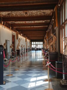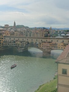 回廊の途中でアルノ川が見渡せる窓があり、そこから眺めるヴェッキオ橋は周りの風景と同化して非常に絵になる光景でした。ぜひ美術館巡りの小休憩にご覧ください。