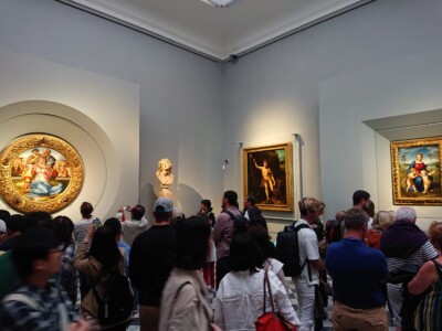 レオナルドダヴィンチやラファエロ、ボッティチェリなどイタリアを代表する芸術家の作品を収めた美術館で、以前はメディチ家が集めた芸術品を納めており、1765年に一般公開されたそうです。主な作品は3階にあり、主要な作品のみを見学する方は、1時間程度あれば観ることができます。また入り口で厳重なセキュリティチェックがあり大きな荷物はクロークに預けます。イヤホンガイドもレンタルできるため、じっくり見学したい方は借りると良いでしょう。