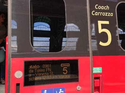 一方別名「フェラーリ特急」とも呼ばれるイタロ。イタリアの民間企業らが共同出資し設立した「NTV社」により運行されております。出資者にはフェラーリ兼フィアットのモンテゼーモロ会長、ファッションブランド「TOD’s」やセリエAの会長など名だたる企業家が出資しています。さらに車体デザインはフェラーリのデザインを手掛けるジョルジェット・フェジャーロ氏が担当し、内装はアルファロメオなどを手掛けたデザイナーが担当する、真っ赤な車体が特徴的です。そのスタイリッシュな車両に惹かれること間違いなしです!
