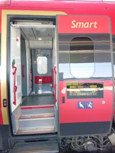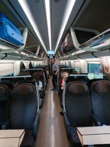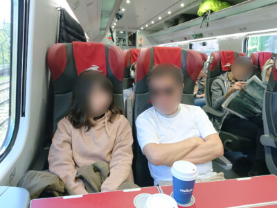 列車等級は4等級あり、上から「クラブ・エグゼクティブ(ファースト)」「プリマ(ビジネス)」「コンフォート(上級エコノミー)」「スマート(エコノミー)」となり、最上級クラス「クラブ・エグゼクティブ」は1両に約20席しかなく、座席配置も1+2、シートのリクライニングはもちろん、タッチパネル式ディスプレイも搭載されています。「プリマ」はウェルカムドリンク、スナックがつき、座席配置は1+2。「コンフォート」も同様に座席配置は1+2、軽食類のサービスがなくなります。一番下の「スマート」は座席配置が2+2、となります。こちら個人的には「スマート」で十分かなといった感じです。