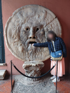 嘘つきは手を噛まれるという言い伝えで有名な顔の形をした大きな石盤です。じつは「サンタマリア・イン・コスメディン」という教会の敷地内にあります。やはり誰しもここに来るとやりたくなる「手を噛まれる」シーンはMustです!