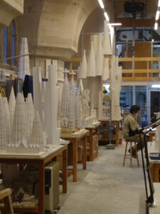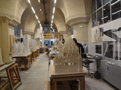 建築技法などガウディについて学ぶことができます。イヤホンガイドの貸し出しもあるので、聞きながら展示を巡ると良いでしょう。そして「未完の大建築」作業している姿を随所に見ることができます。
