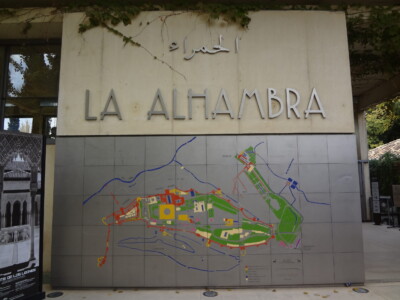 宮殿と呼ばれていますが、城塞としての機能も備えており、住居、官庁、モスク、学校、浴場など様々な施設があったそうです。城壁の中に一歩踏み込めば、かつて栄華を極めたグラナダ王国にタイムスリップできます。ちなみに「アルハンブラ」とは、「赤い城」の意味です。早速チケットを購入し入場します。当日だと購入できない場合もありますので、事前購入をオススメいたします。また位置関係がわかるよう全体図を作成しましたのでよろしければ、併せてご覧ください。