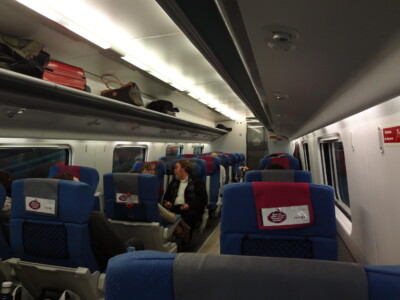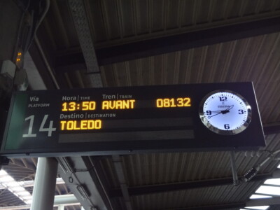 マドリードの中心駅「アトーチャ」駅から特急(AVANT)で約30分です。セキュリティチェックを受け、ホームへ向かいます。電車のシート配列は2席 ― 1席で、ご家族やカップルで行かれる場合は2名掛け、1人旅は1名掛けが良いでしょう。車窓からのどかな風景を見ているとあっという間に「Toledo(トレド)」到着です。