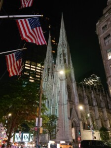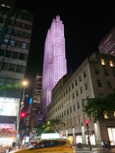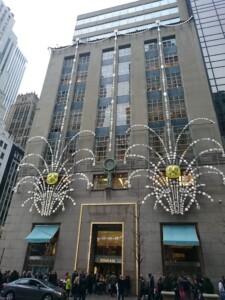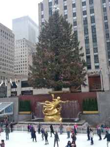 続いて「ロックフェラーセンタービル」です。大富豪、ロックフェラー氏によって建設されたビル、現在は複合施設となっており、中心の半地下プラザには、万国の国旗、プロメテウスの黄金像が立ち、夏にはカフェテラス、冬にはアイススケートリンクとして使用されます。クリスマスシーズンになると、大きなクリスマスツリーが飾られることでも有名です。