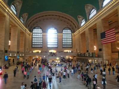 そろそろお腹も空いてくる頃、「グランドセントラル駅」へ向かいます。この巨大な駅舎は歴史的建造物で、現在も多くの通勤列車が発着するターミナル駅です。44面のプラットフォームがあり、単一の駅としては世界最大規模、1日700本の列車が離発着し、70万人が利用します。駅にはさまざまなショップがあり、鉄道好きにはたまらないお店もあります。ぜひお土産にいかがでしょうか?