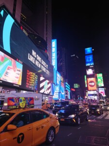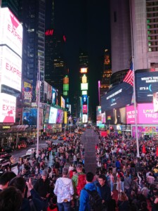 そして最後は「タイムズスクエア」!ニューヨークといえばここ!!というくらい代表的な場所で、大晦日のカウントダウンは世界的にも有名です。色鮮やかな世界中の企業広告やディスプレイで夜中でも明るいです。階段があり、こちらに座ってみたり、写真の撮るものいいでしょう。そしてお土産にオススメは、ディズニーストアにあるニューヨーク限定「自由の女神ミニー」です。ご家族、友人にいかがでしょうか?