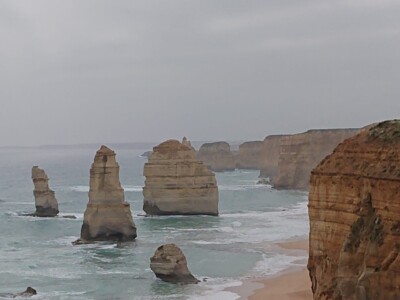 とにかく長い海岸線、中でもハイライトは「12人の使徒」と呼ばれるスポットです。切り立った断崖絶壁が20km以上にわたって続く、ポート・キャンベル付近の海岸線は、グレートオーシャンロード最大の見どころです。海中からそびえ立つ奇岩がキリストの使徒のように見えたことからそう呼ばれています。高さ数十mの断崖は、太古の時代に海底が隆起して形成され、現在も風と波による侵食が続いているそうです。そのスケールには圧巻され、朝夕の光景はとくに美しく、オススメの時間帯です。